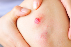 転んだり、引っかいたりした傷は、すぐに流水で汚れを落とし、きれいなタオルなどで押さえて受診してください。消毒液などを塗る必要もありません。